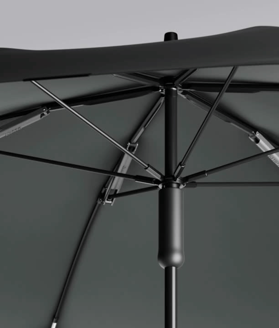 The BLUNT Umbrella frame features a unique strut mechanism that stresses the ribs, creating an effortless outward tension in the canopy as the umbrella is opened.